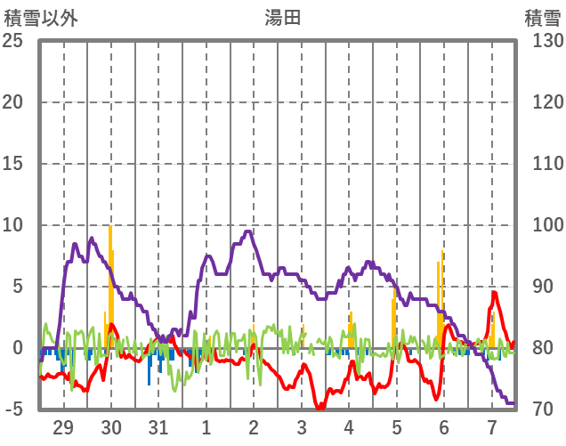 | 日 | 時 | 気温 | 降水 | 風向/風速 | 日照 | 積雪 | 降雪 |