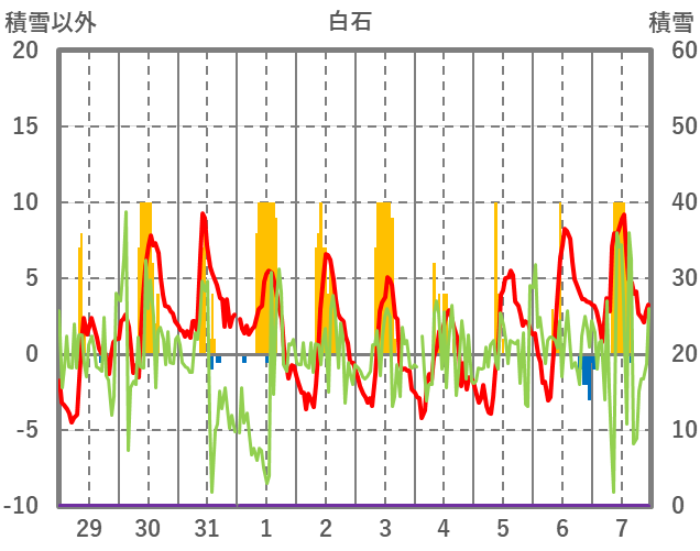 | 日 | 時 | 気温 | 降水 | 風向/風速 | 日照 | 積雪 | 降雪 |