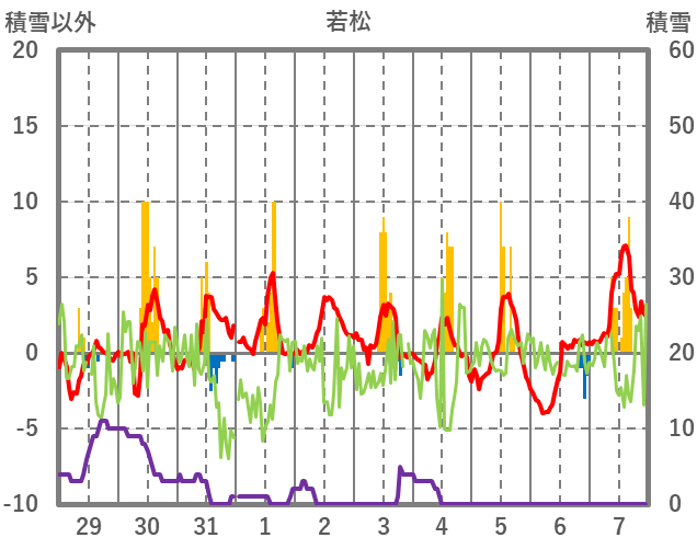 | 日 | 時 | 気温 | 降水 | 風向/風速 | 日照 | 積雪 | 降雪 |
