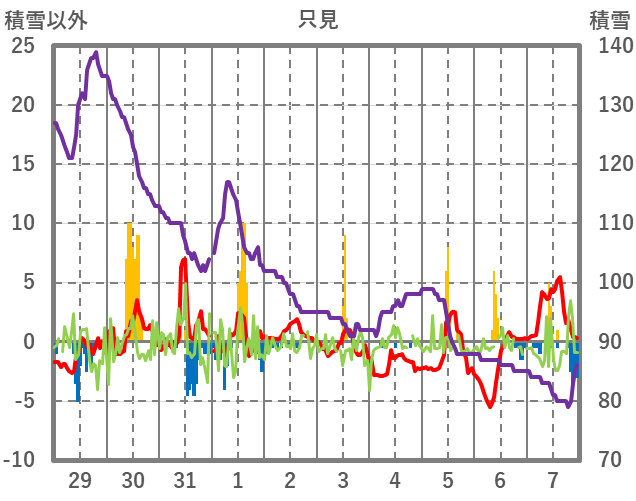 | 日 | 時 | 気温 | 降水 | 風向/風速 | 日照 | 積雪 | 降雪 |