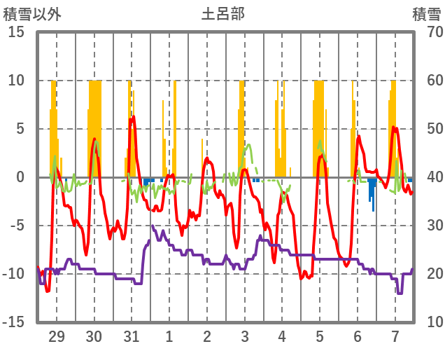 | 日 | 時 | 気温 | 降水 | 風向/風速 | 日照 | 積雪 | 降雪 |