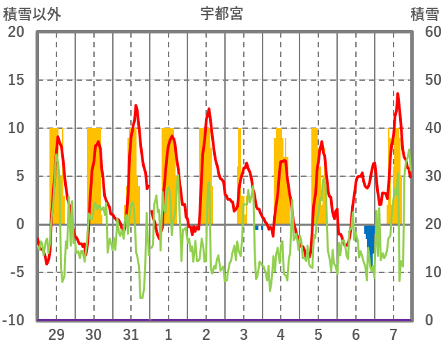 | 日 | 時 | 気温 | 降水 | 風向/風速 | 日照 | 積雪 | 降雪 |