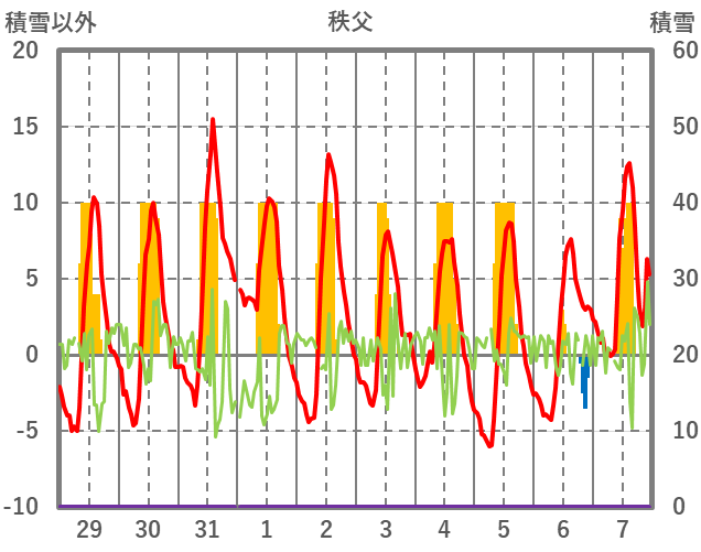 | 日 | 時 | 気温 | 降水 | 風向/風速 | 日照 | 積雪 | 降雪 |