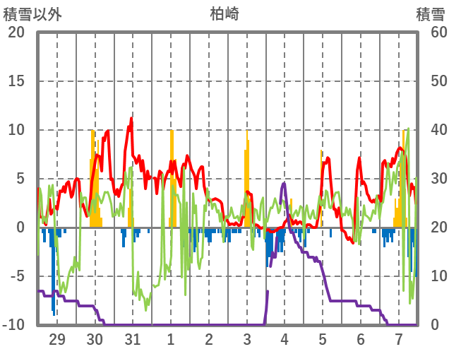 | 日 | 時 | 気温 | 降水 | 風向/風速 | 日照 | 積雪 | 降雪 |
