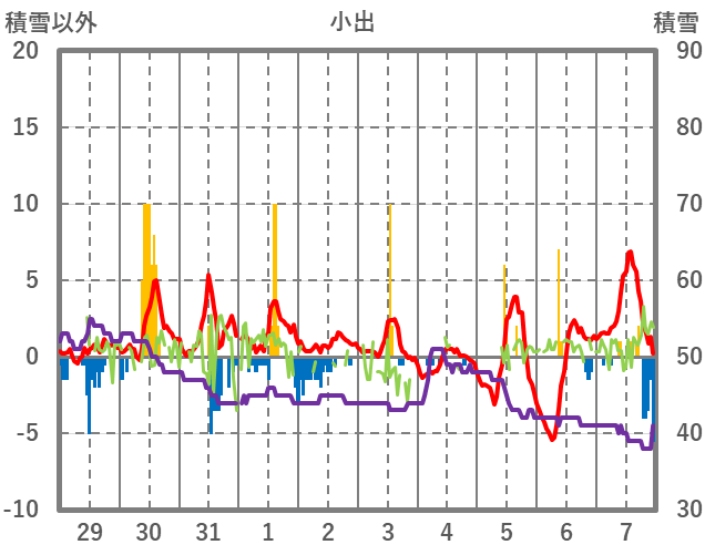| 日 | 時 | 気温 | 降水 | 風向/風速 | 日照 | 積雪 | 降雪 |