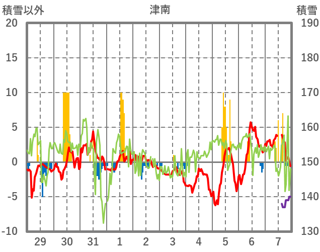 | 日 | 時 | 気温 | 降水 | 風向/風速 | 日照 | 積雪 | 降雪 |
