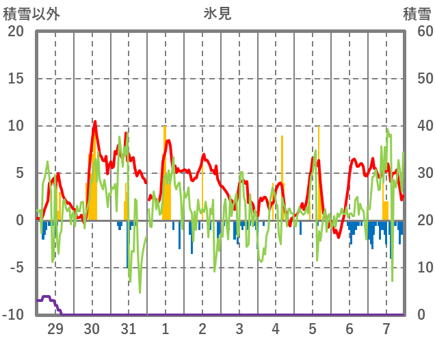 | 日 | 時 | 気温 | 降水 | 風向/風速 | 日照 | 積雪 | 降雪 |