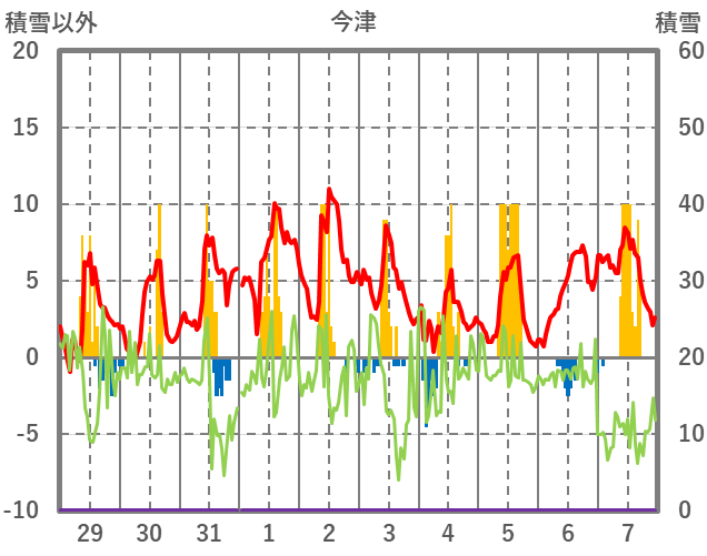 | 日 | 時 | 気温 | 降水 | 風向/風速 | 日照 | 積雪 | 降雪 |