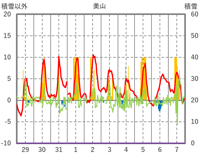 | 日 | 時 | 気温 | 降水 | 風向/風速 | 日照 | 積雪 | 降雪 |