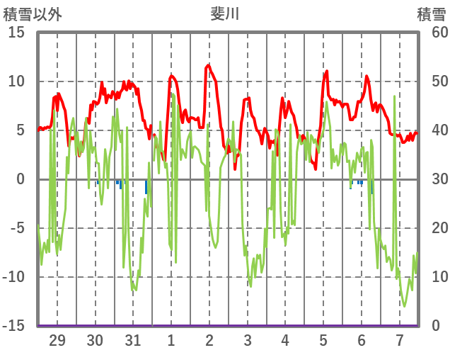 | 日 | 時 | 気温 | 降水 | 風向/風速 | 日照 | 積雪 | 降雪 |
