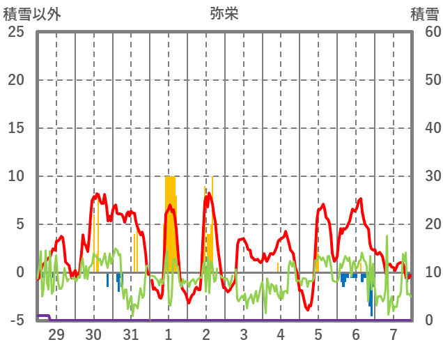 | 日 | 時 | 気温 | 降水 | 風向/風速 | 日照 | 積雪 | 降雪 |