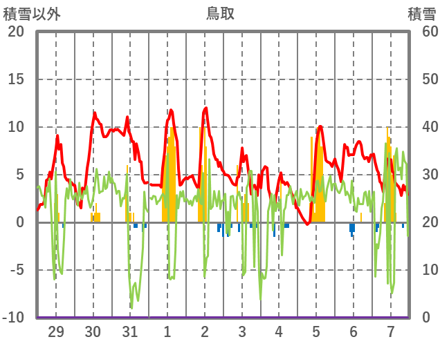 | 日 | 時 | 気温 | 降水 | 風向/風速 | 日照 | 積雪 | 降雪 |