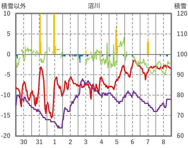 | 日 | 時 | 気温 | 降水 | 風向/風速 | 日照 | 積雪 | 降雪 |