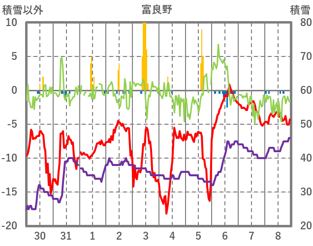 | 日 | 時 | 気温 | 降水 | 風向/風速 | 日照 | 積雪 | 降雪 |