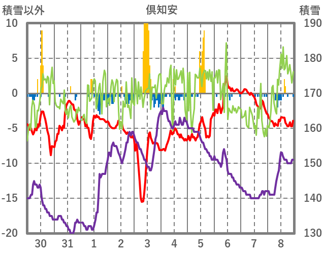 | 日 | 時 | 気温 | 降水 | 風向/風速 | 日照 | 積雪 | 降雪 |