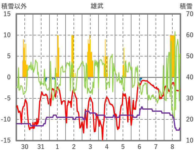 | 日 | 時 | 気温 | 降水 | 風向/風速 | 日照 | 積雪 | 降雪 |