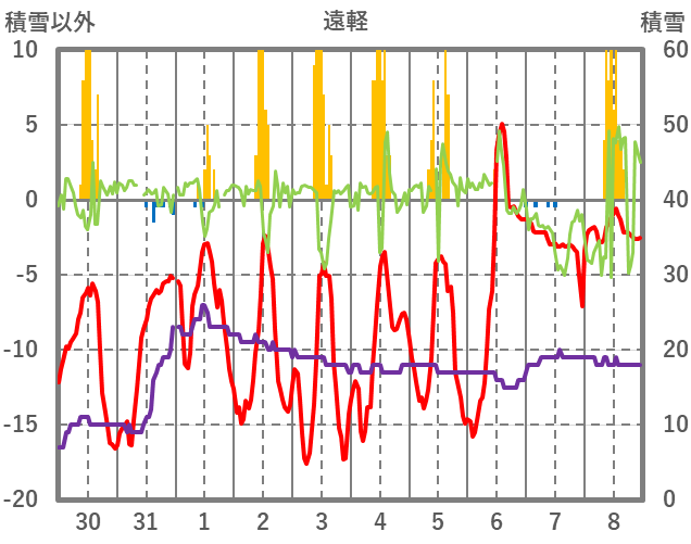 | 日 | 時 | 気温 | 降水 | 風向/風速 | 日照 | 積雪 | 降雪 |