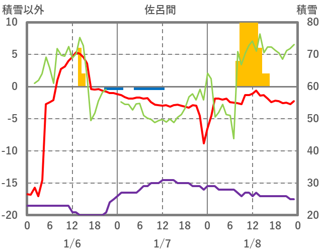 | 日 | 時 | 気温 | 降水 | 風向/風速 | 日照 | 積雪 | 降雪 |