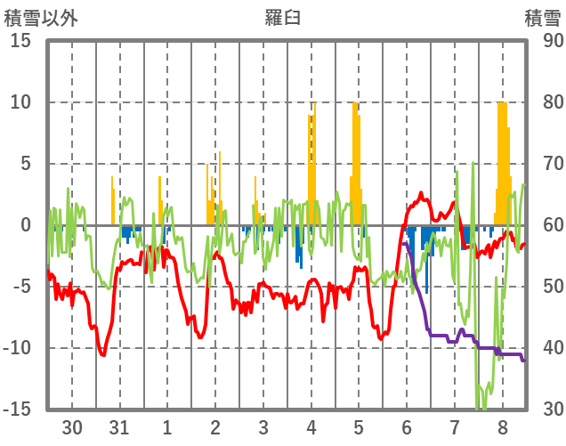 | 日 | 時 | 気温 | 降水 | 風向/風速 | 日照 | 積雪 | 降雪 |