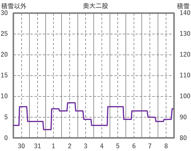 | 日 | 時 | 気温 | 降水 | 風向/風速 | 日照 | 積雪 | 降雪 |