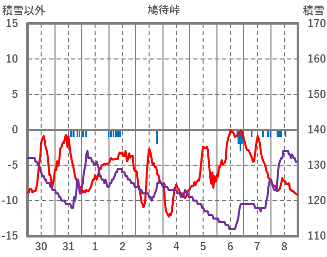 | 日 | 時 | 気温 | 降水 | 風向/風速 | 日照 | 積雪 | 降雪 |