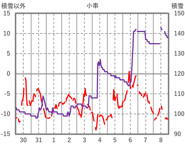 | 日 | 時 | 気温 | 降水 | 風向/風速 | 日照 | 積雪 | 降雪 |
