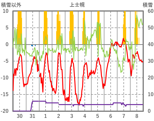 | 日 | 時 | 気温 | 降水 | 風向/風速 | 日照 | 積雪 | 降雪 |