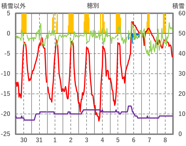 | 日 | 時 | 気温 | 降水 | 風向/風速 | 日照 | 積雪 | 降雪 |