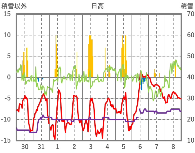 | 日 | 時 | 気温 | 降水 | 風向/風速 | 日照 | 積雪 | 降雪 |