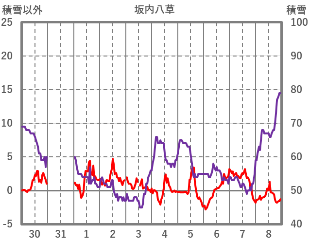 | 日 | 時 | 気温 | 降水 | 風向/風速 | 日照 | 積雪 | 降雪 |