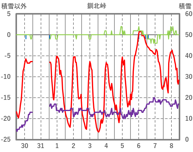 | 日 | 時 | 気温 | 降水 | 風向/風速 | 日照 | 積雪 | 降雪 |