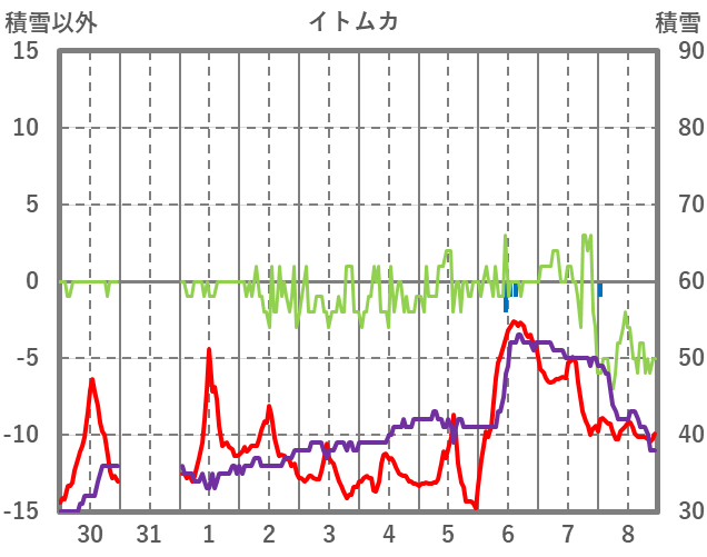 | 日 | 時 | 気温 | 降水 | 風向/風速 | 日照 | 積雪 | 降雪 |