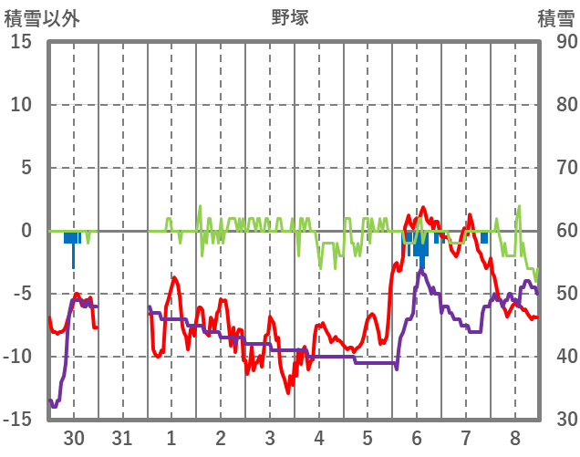 | 日 | 時 | 気温 | 降水 | 風向/風速 | 日照 | 積雪 | 降雪 |