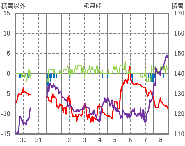 | 日 | 時 | 気温 | 降水 | 風向/風速 | 日照 | 積雪 | 降雪 |