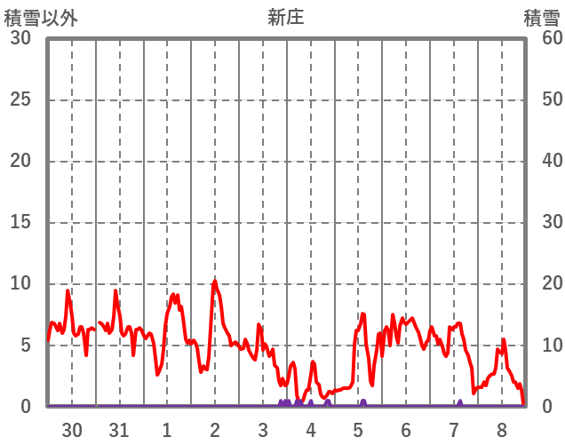 | 日 | 時 | 気温 | 降水 | 風向/風速 | 日照 | 積雪 | 降雪 |