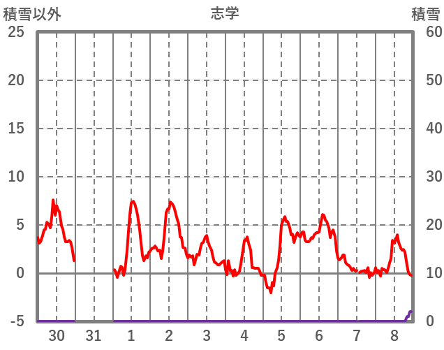 | 日 | 時 | 気温 | 降水 | 風向/風速 | 日照 | 積雪 | 降雪 |