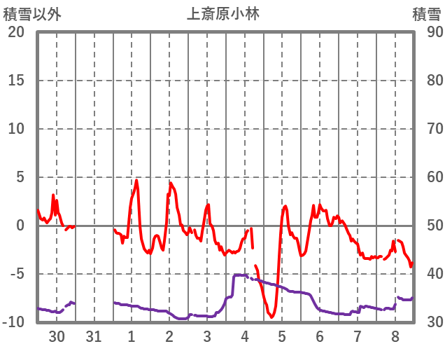 | 日 | 時 | 気温 | 降水 | 風向/風速 | 日照 | 積雪 | 降雪 |