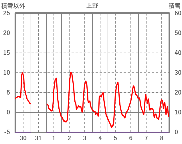 | 日 | 時 | 気温 | 降水 | 風向/風速 | 日照 | 積雪 | 降雪 |