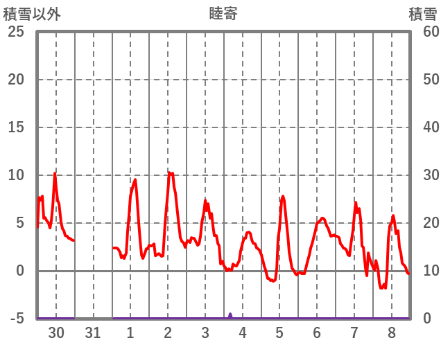 | 日 | 時 | 気温 | 降水 | 風向/風速 | 日照 | 積雪 | 降雪 |