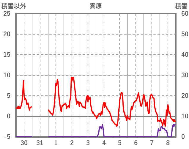 | 日 | 時 | 気温 | 降水 | 風向/風速 | 日照 | 積雪 | 降雪 |