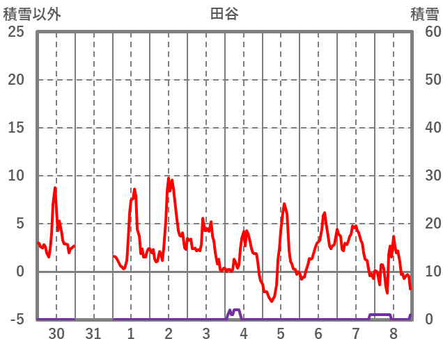 | 日 | 時 | 気温 | 降水 | 風向/風速 | 日照 | 積雪 | 降雪 |