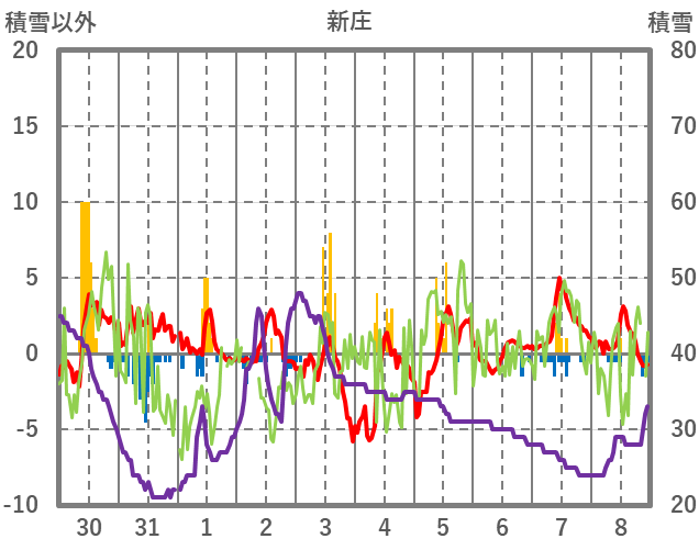 | 日 | 時 | 気温 | 降水 | 風向/風速 | 日照 | 積雪 | 降雪 |
