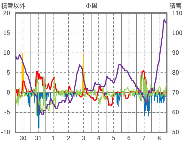 | 日 | 時 | 気温 | 降水 | 風向/風速 | 日照 | 積雪 | 降雪 |