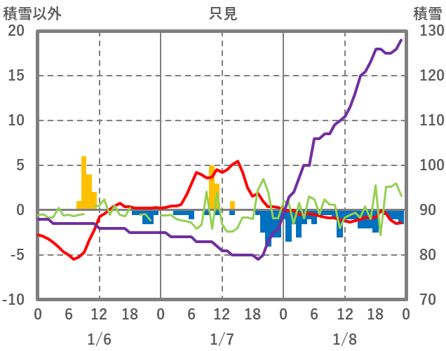 | 日 | 時 | 気温 | 降水 | 風向/風速 | 日照 | 積雪 | 降雪 |