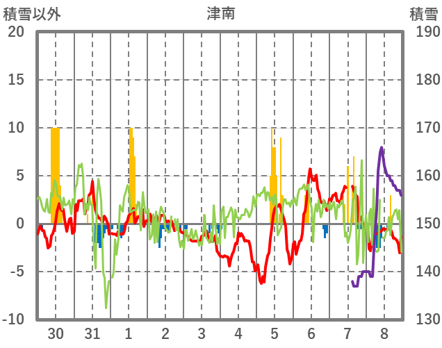 | 日 | 時 | 気温 | 降水 | 風向/風速 | 日照 | 積雪 | 降雪 |