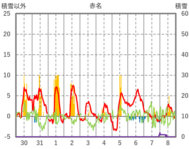 | 日 | 時 | 気温 | 降水 | 風向/風速 | 日照 | 積雪 | 降雪 |