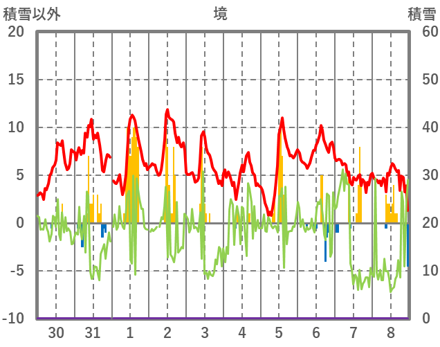 | 日 | 時 | 気温 | 降水 | 風向/風速 | 日照 | 積雪 | 降雪 |
