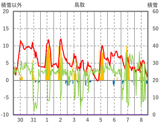 | 日 | 時 | 気温 | 降水 | 風向/風速 | 日照 | 積雪 | 降雪 |