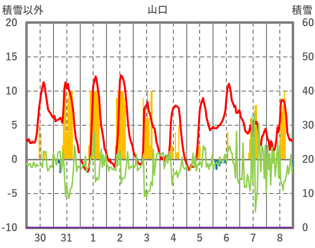 | 日 | 時 | 気温 | 降水 | 風向/風速 | 日照 | 積雪 | 降雪 |