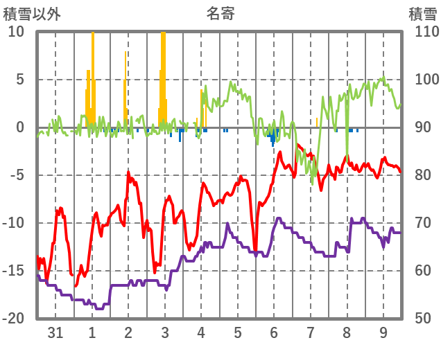 | 日 | 時 | 気温 | 降水 | 風向/風速 | 日照 | 積雪 | 降雪 |